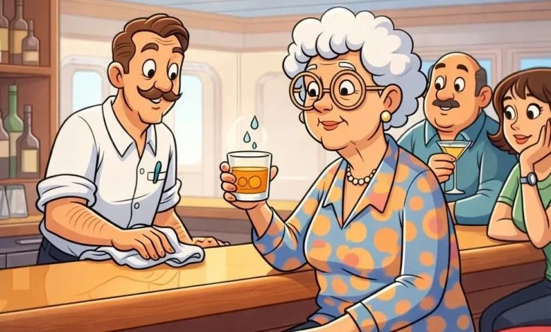 An elderly woman walked into the bar on a cruise ship and politely ordered a Scotch with just two drops of water. When the bartender