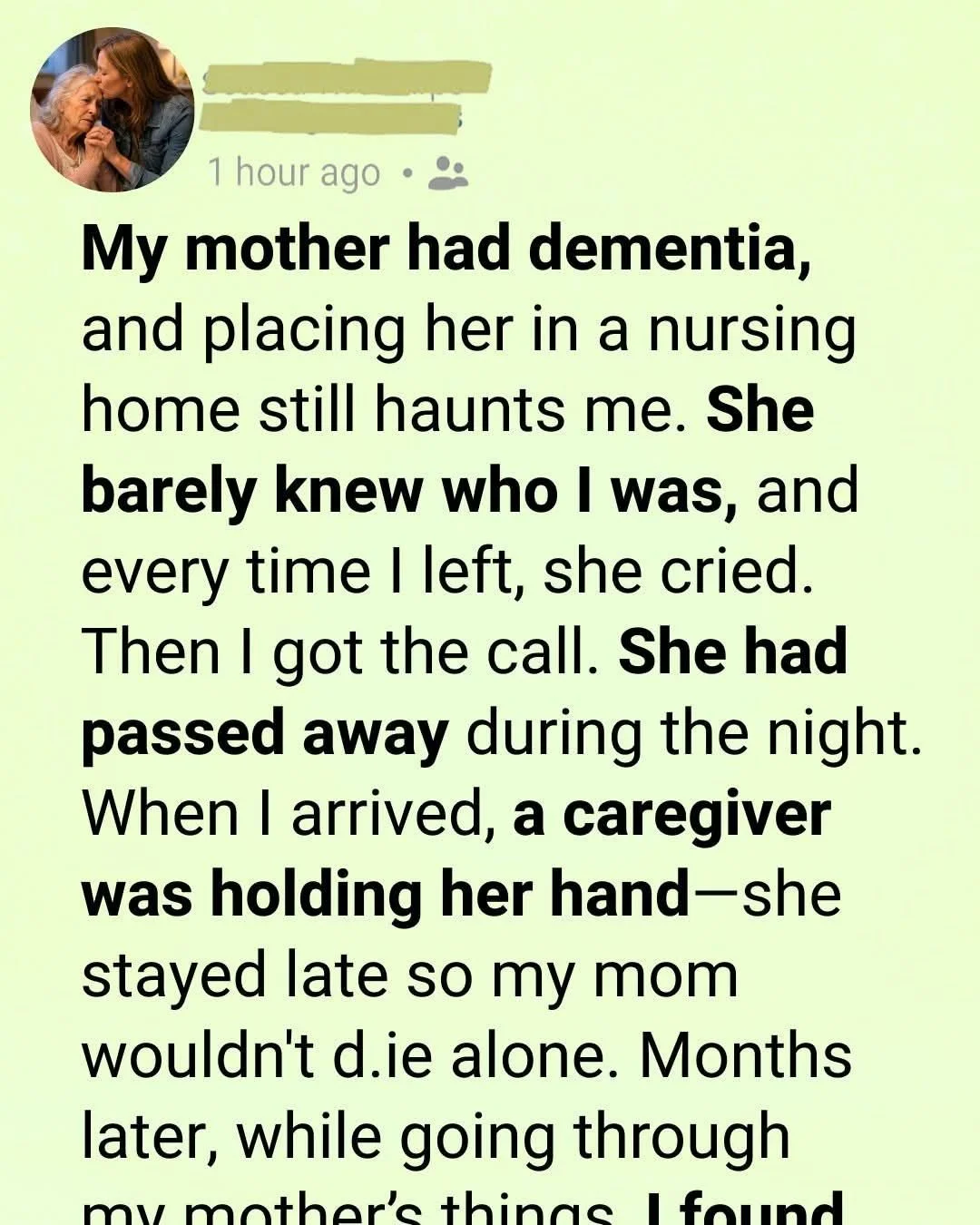My mother had dementia. By the time I could no longer care for her myself, she barely remembered my name. Some days, she thought I