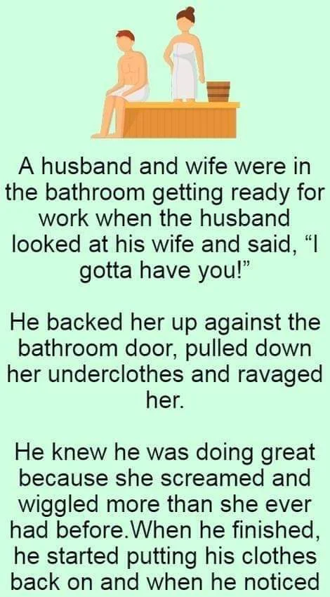 A husband and wife were in the bathroom getting ready for work when the husband looked at his wife and said, “I gotta have you!”