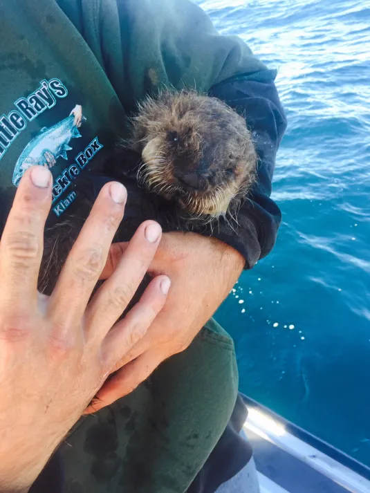 Without hesitation, Alistair steered the boat towards the tiny creature, careful not to startle it further. He extended his long-handled net, reaching out to scoop the otter from the cold, threatening waters. The pup, now trembling and terrified, was gently lifted from the sea and into Alistair’s care.