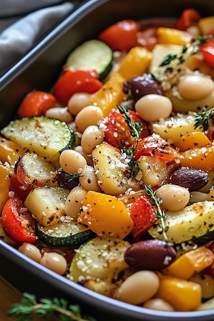 Rustic Roasted Vegetable Bake with Cannellini Beans – A Mediterranean Comfort Dish for Every Table