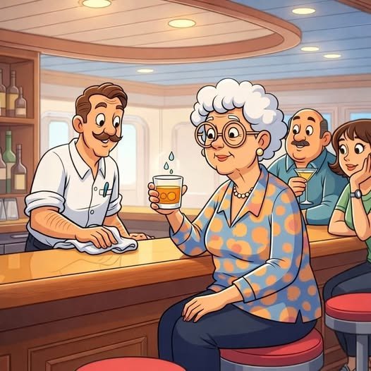 An elderly woman walked into the bar on a cruise ship and politely ordered a Scotch with just two drops of water.