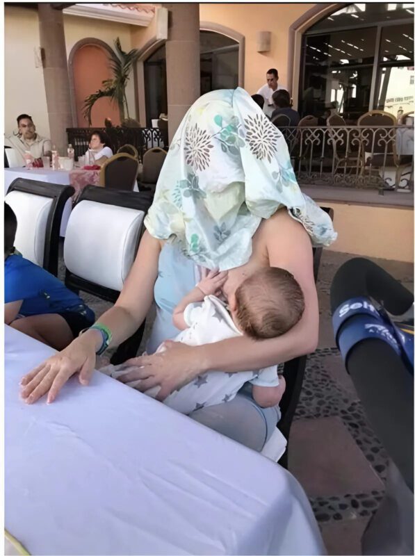 In a moment of brilliant clarity, Melanie decided to teach the man a lesson he wouldn’t forget. She agreed to “cover up,” but not in the way he intended. Rather than draping a blanket over her baby, she placed it over her own head. This witty and symbolic act flipped the script entirely. It visually communicated that the issue was the man’s gaze, not her actions. By covering her face, she highlighted the ridiculousness of being asked to hide the act of feeding her hungry child.