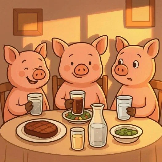 At last, he politely asked the third pig why he had been drinking only water all evening. The pig grinned and explained that someone had to be ready to make the long walk home a little more fun. The table erupted in laughter, and even the waiter joined in.