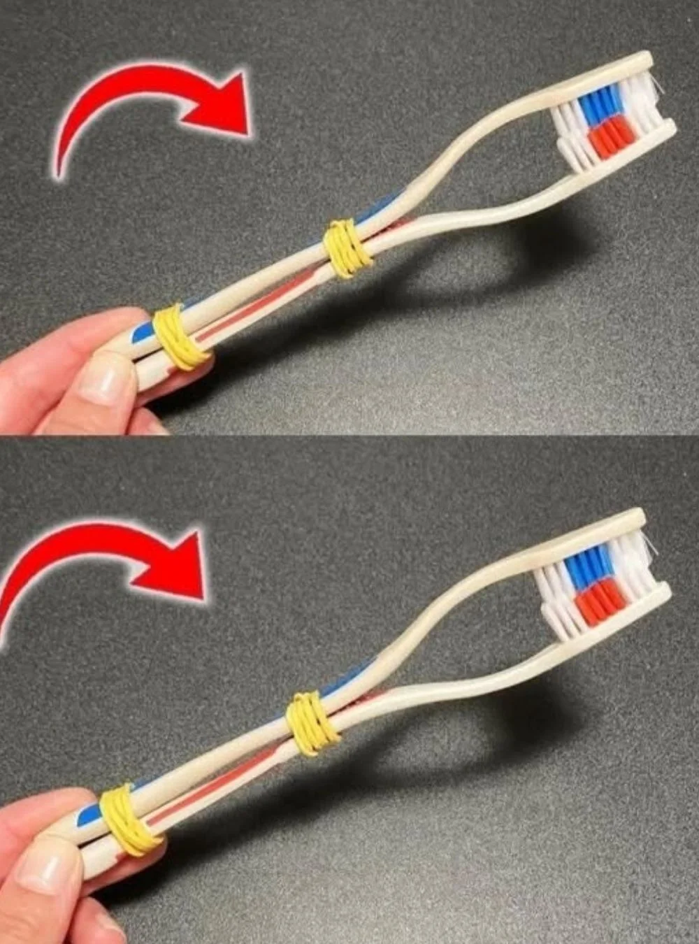 Now for the clever trick most people never consider: tying two old toothbrushes together. Secured with a rubber band or tape, they form a simple clamp with bristles facing inward. This setup allows you to scrub both sides of narrow spaces at the same time—such as faucet edges, shower rails, sliding door tracks, or even bicycle chains. The opposing bristles work together to remove grime quickly and efficiently, saving both time and effort.