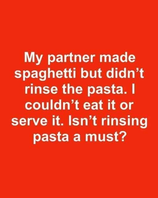 My partner cooked spaghetti but skipped rinsing the noodles. I couldn’t bring myself to eat it or offer it to anyone else. Isn’t rinsing pasta something you’re supposed to do?