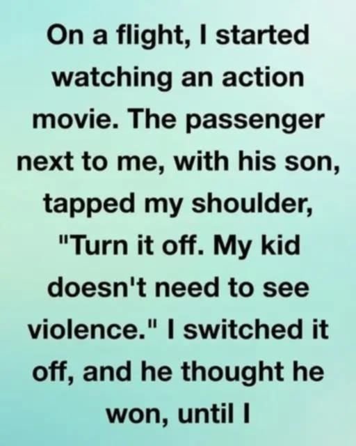 On a flight, I started watching an action movie. The passenger next to me, with his son, tapped my shoulder, “Turn it off. My kid
