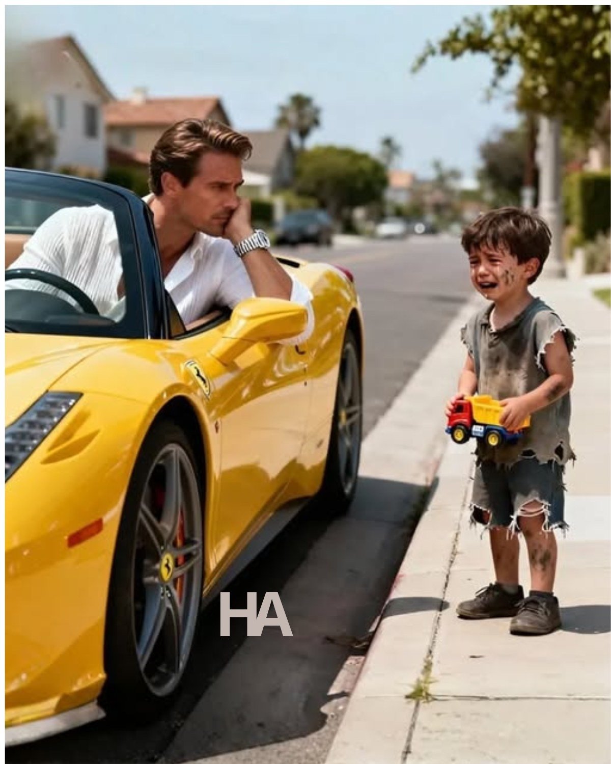 You are sitting low in a yellow Ferrari that looks like a shout on wheels, trapped at a red light on Wilshire Boulevard while Los
